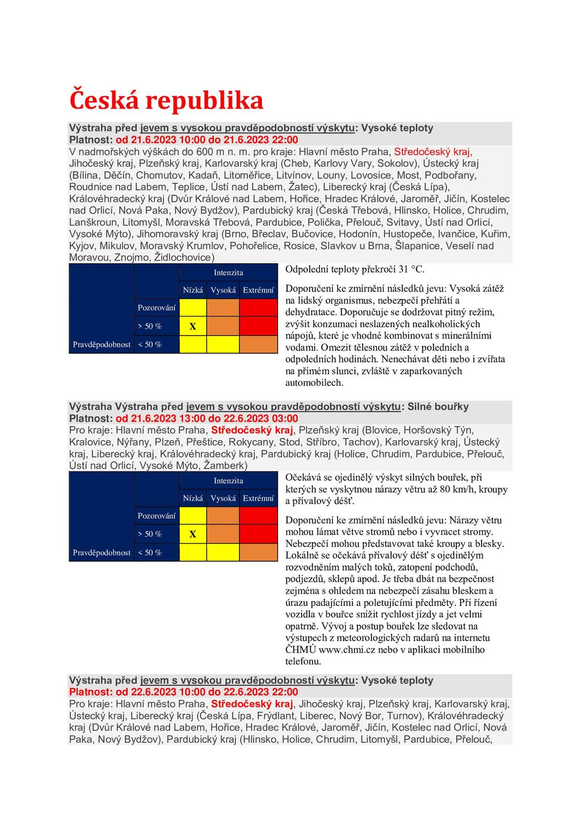 21.6. 13:00 - 22.6. 3:00 SILNÉ BOUŘKY, očekává se ojedinělý výskyt silných bouřek, při kterých se vyskytnou nárazy větru až 80 km/h, kroupy a přívalový déšť