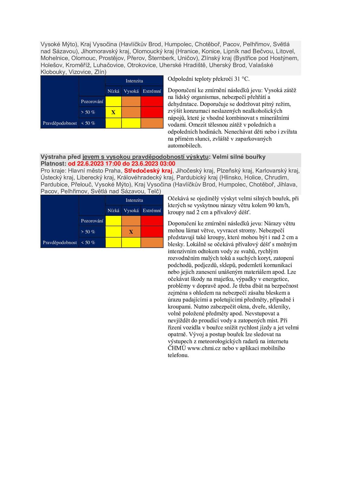 22.6. 17:00 - 23.6. 3:00 VELMI SILNÉ BOUŘKY, Očekává se ojedinělý výskyt velmi silných bouřek, při kterých se vyskytnou nárazy větru kolem 90 km/h, kroupy nad 2 cm a přívalový déšť.